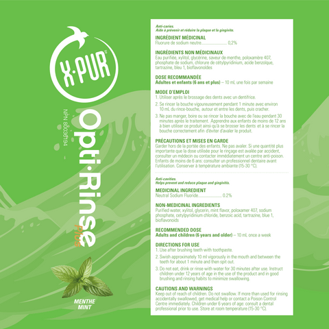 X-PUR Opti-Rinse Plus is a oral rinse that contains fluoride and a powerful new ingredient called Citrox®, which is a bioflavonoid complex extracted from bitter oranges, effective at killing bacteria and viruses while breaking down biofilm. Recommended to prevent plaque and gingivitis.